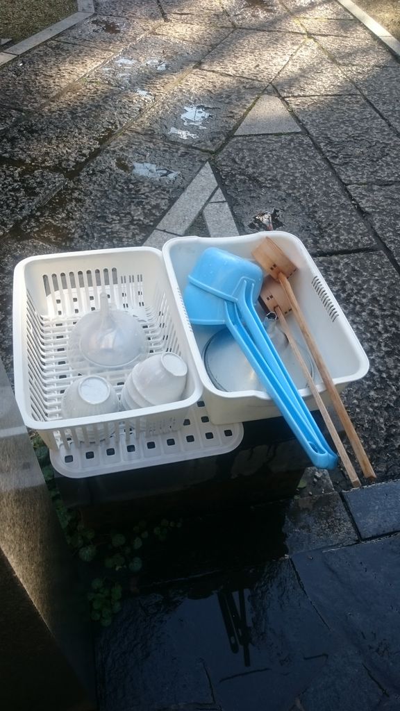 柄杓とコップを持ち…