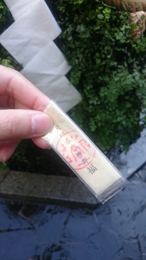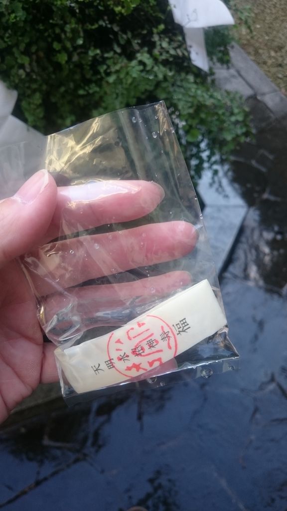 お守りを天明水にひたし…